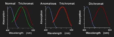 So what is color blindness exactly? Well, in every eye there are things called cones that are sensitive to different color lights. Normally, humans have three different types of cones that are each sensitive to blue, green, or red. However, in certain cases with humans it is possible for some of the rods to have shifted color sensitive or the rods are missing all together, causing dramatic decreases in visual range. For examples, anomalous trichromatism is when there is a shift in the sensitive of one the rods. A common example of this is when the peak sensitivity of the green cones moves toward a higher wavelength, overlapping with the sensitivity of the red cones. This leads to red green colorblindness, where people have a difficulty distinguishing between red and green and many of those colored objects take on a orange tint.